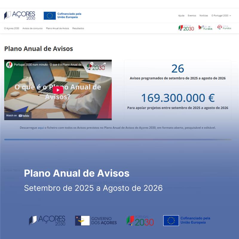 O Programa Açores 2030 publicou o seu Plano Anual de Avisos para o período de setembro de 2025 a agosto de 2026, prevendo a abertura de 27 concursos que mobilizam um investimento global de 169,3 milhões de euros de fundos europeus para apoiar iniciativas na Região.